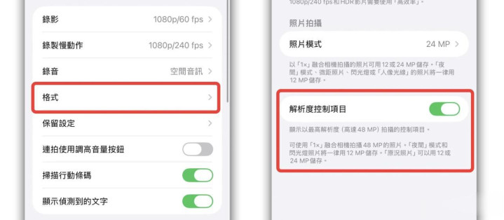 设置 > 相机 > 格式 > 开启「分辨率控制」。
