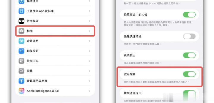 打开 设置 > 相机 > 开启「微距控制」。